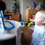 Henry has spent lots of time playing with a musical reindeer and a penguins race today – he was very excited to see all the Christmas decorations when he got up this morning. Henry coloured a picture of Santa with his felt tip pens – there has never been such a multi-coloured Santa before! He has been rather obsessed with his wellies today, putting them on and running around in them all the time.
